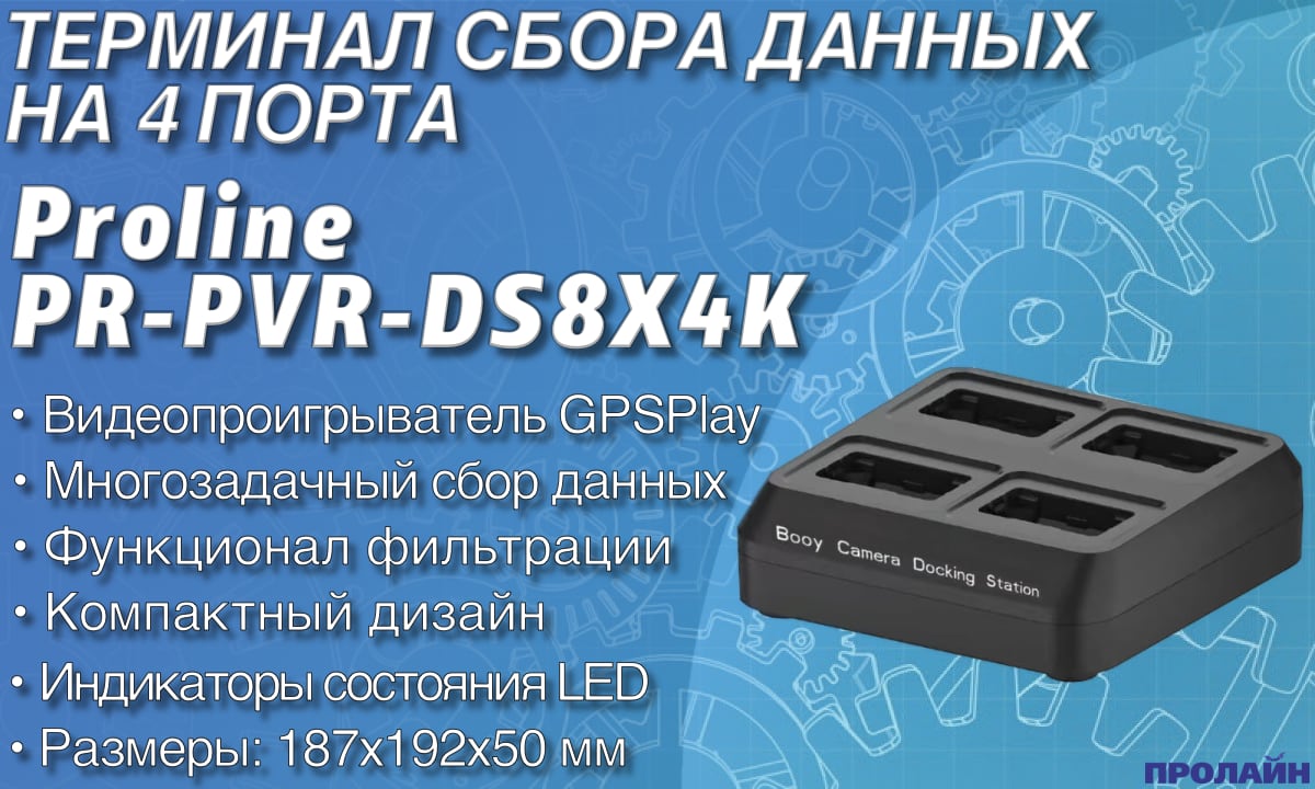 Терминал для сбора данных Proline PR-PVR-DS86B предназначен для одновременного сеанса с 4 персональными видеорегистраторами серии PR-PVRX6B. Устройство имеет посадочные места с MiniUSB-кабелями для сопрягаемых регистраторов. Прибор способен объединить и обеспечить одновременную передачу фото и видеоматериалов на ПК. Сетевой концентратор может также подавать питание на каждый из подключенных устройств.