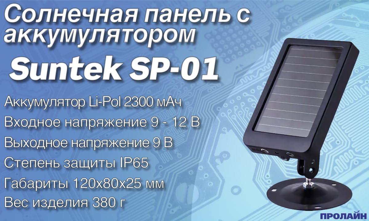 Солнечная панель со встроенным аккумулятором используется как дополнительный источник питания с уникальной возможностью подзарядки от света. Suntek SP-01 – это солнечная панель с литий-ионным аккумулятором на 2300 мАч, предназначенная для питания большинства 4G и 2G фотоловушек. Использование этой солнечной батареи в сочетании со встроенным аккумулятором значительно продлевает время автономной работы видеокамер и ловушек. В комплект входят все необходимые элементы для полноценной работы. Данная панель совместима со всеми моделеми камер Suntek Trail, фотоловушек серии HC-300 HC-300A / HC-300M / HC-350M / HC-350G / серии HC-500 HC-500A / HC-500M / HC-550M / HC-550G / серии HC-700 HC-700M / HC-700G / HC-700LTE / серии HC-800 HC-800LTE / HC-801LTE-LI / HC-801Pro-LI / TUYA808 / TUYA808-LI / HC-810LTE / серии HC-900 HC-900LTE-LI / TUYA940-LI / HC-960Pro-LI. Питание от солнца может быть как основным источником энергии, так и дополнительным.