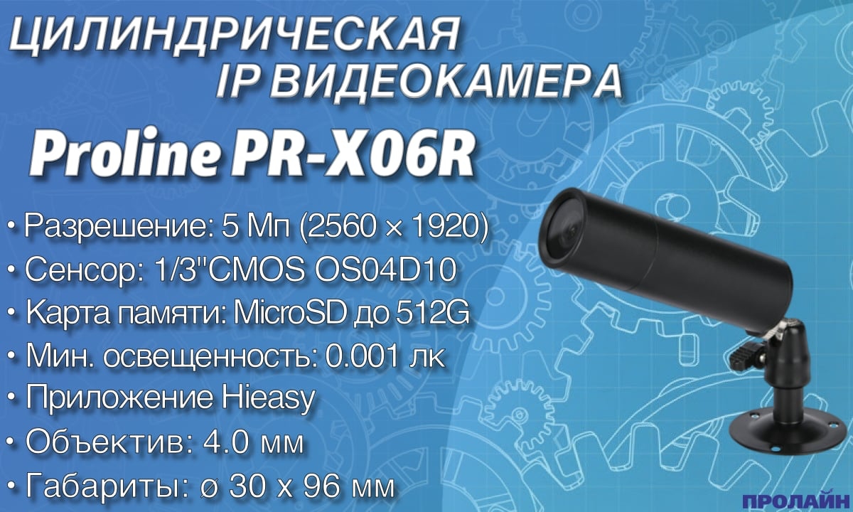 Цилиндрическая IP камера Proline PR-X06R выполнена в миниатюрном цилиндрическом корпусе и предназначена для использования внутри помещений. Небольшие габариты IP видеокамеры и широкий угол обзора позволяют разместить ее в небольших помещениях таким образом, чтобы она была максимально незаметна и при этом позволяла охватить его в поле зрения. Миниатюрная IP камера Proline IP-X06R может быть установлена в помещениях, где есть требования к миниатюрным размерам видеокамеры. Максимальная разрешающая способность камеры составляет 2560 × 1920 пикселей. Благодаря поддержке протокола ONVIF v2.4 устройство обладает широкой совместимостью с видеорегистраторами различных производителей.