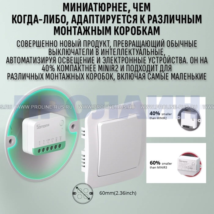 - Компактный дизайн для скрытого монтажа: Благодаря небольшим размерам, устройство идеально подходит для установки в стандартные распределительные коробки и розеточные блоки, обеспечивая скрытую и аккуратную установку.