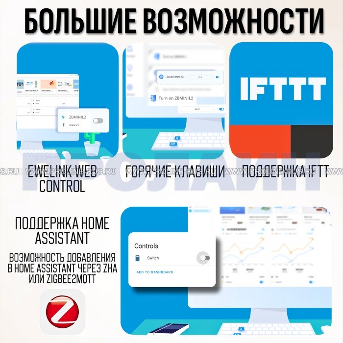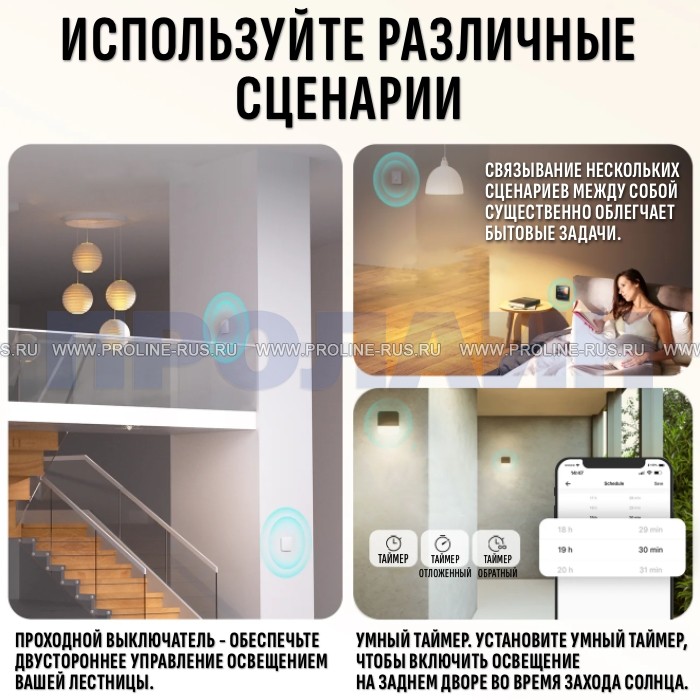 В приложении можно выставить график работы, время включения или отключения после срабатывания, а также задать интервалы, через которые будет происходить периодическое включение. Кроме того, есть возможность привязать последовательно сразу 2 выключателя, например, для управления светом в разных концах помещения или лестничного пролёта. Свое применение Wi-Fi выключатель Sonoff ZBMINIL2 найдет в связке с воротами, замками, освещением, септиками, обогревателями и любым другим электрооборудованием. Отметим возможность работы в режиме DIY, для этого необходимо установить внутрь комплектную перемычку. При этом стандартное приложение работать с ним не будет, зато вы получаете возможность интеграции с Home Assistant и управлением реле с помощью REST-команд. Для беспроводного подключения используется Wi-Fi 2.4 a/b/n, сила тока может доходить до 6А. Сцены управления с SONOFF ZBMINIL2! Коммутатор ZBMINI Extreme (SONOFF ZBMINIL2) обеспечивает двустороннее управление освещением на лестнице, позволяя удобно и безопасно включать или выключать свет с обоих уровней. Вы также можете устанавливать таймеры обратного отсчета, расписания и циклы работы освещения в соответствии с вашими потребностями. Кроме того, устройство поддерживает голосовое управление через такие платформы, как Amazon Alexa, Google Home и Алиса. Просто произнесите команду, и свет включится или выключится мгновенно!
