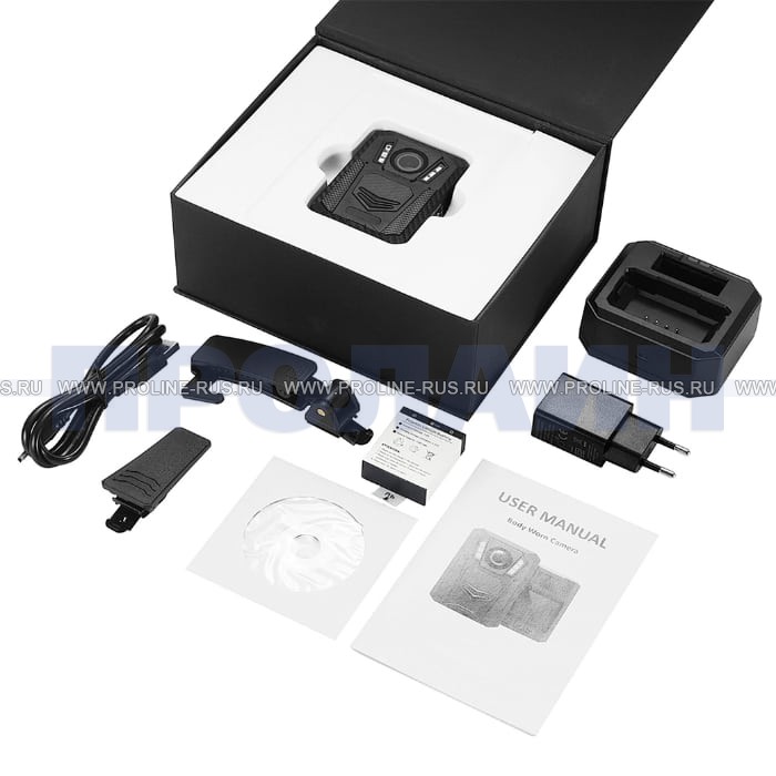 Регистратор обладает защитой по протоколу IP68, что гарантирует полную изоляцию от попадания пыли внутрь устройства, а капли воды или дождя не помешают его работе. Отличительной особенностью аппарата является сверх высокое четкость с разрешением 1512P (2688 x 1512), наличие GPS-модуля для фиксации координат местоположения прямо на записи, а также возможность провести синхронизацию с Google Maps для создания подробных маршрутов местности при патрулировании. Кроме того, модель Proline PR-PVRX6BGW-256 способна подключаться к сети Wi-Fi, что позволяет оперативнее передавать файлы съемки другим или загружать их на внешнее хранилище. ИК-диоды, обеспечивающие запись в темноте до 15 метров, а таже LED-подсветка позволяют не беспокоиться за качество изображения при съемке в условиях ограниченной видимости. Будьте уверены, что записали все необходимое и не пропустили ничего важного благодаря широкому углу обзора 170° по диагонали и 140° по горизонтали. Регистратор оснащен разъемом Type С USB 2.0 для подключения к внешним устройствам. Для управления и настройки устройства на его торцах и задней стороне расположены все необходимые элементы управления: кнопки быстрой съемки, включение подсветки, кнопки записи видео и фото, включение микрофона, а также кнопки навигации по меню. В комплекте с регистратором идет зарядная док-станция для установки в автомобиле или помещении.