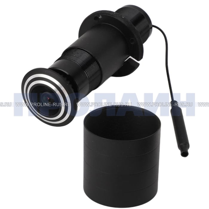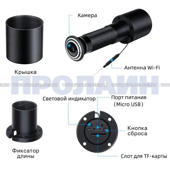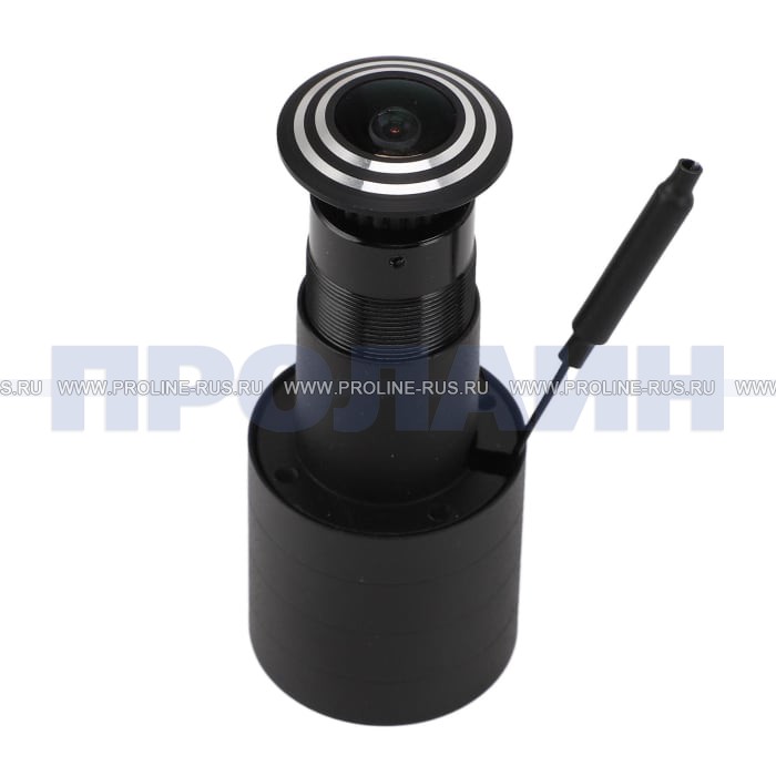 Proline PR-X02W Видеоглазок оснащен аналоговой видеомодулем с разрешением 1080 пикселей (Full HD). Устройство выглядит как обычный глазок и ничем не отличаются не только визуально, но и своими размерами. Благодаря своей цилиндрической форме, видеоглазок легко устанавливается в стандартные деревянные и металлические двери любого типа с диаметром врезного отверстия 23 миллиметра и толщиной от 40 до 85 миллиметров. Крепление в двери видеоглазка осуществляется с помощью спецгайки, накручиваемой на цилиндрический корпус видеоглазка, имеющего резьбу на своей поверхности. Таким образом вы сможете смонтировать их на посадочное место дверных глазков без каких-либо конструктивных изменений. Камера предназначена для функционирования в помещении при комнатной температуре. Питается от источника постоянного тока 12 В. Благодаря простоте в монтаже и неприхотливости в эксплуатации устройство не требует дополнительных технических знаний и может быть установлено самостоятельно. Специальная линза на объективе предоставляет возможность использовать технологию «Рыбий глаз», что обеспечивает максимальный угол обзора. Это важно для наблюдения за происходящим перед дверью, так как отсутствуют мёртвые зоны, что увеличивает безопасность и контроль за ситуацией. На торцевой части камеры, обращённой внутрь помещения, находятся слот для карты памяти, кнопка сброса настроек, разъём питания и микрофон. Наличие микрофона позволяет добавлять звук к записанному видео, что ещё больше увеличивает информативность запечатлённых событий. Для питания WI-FI видеоглазка необходим сетевой источник питания или внешний аккумулятор, что позволяет гибко подойти к вопросам установки устройства. После установки карты памяти и подключения к источнику питания, на корпус накручивается специальная крышка, затрудняющая доступ к разъёмам посторонним лицам или детям, что добавляет дополнительный уровень безопасности. Гибкая WI-FI антенна, размещённая внутри двери, настраивается для обеспечения максимального радиуса действия передатчика. Важно отметить, что камера работает только на частоте 2,4 ГГц и не поддерживает сеть 5 ГГц, поэтому перед покупкой рекомендуется уточнить информацию о частоте вашего роутера, чтобы гарантировать совместимость устройства.