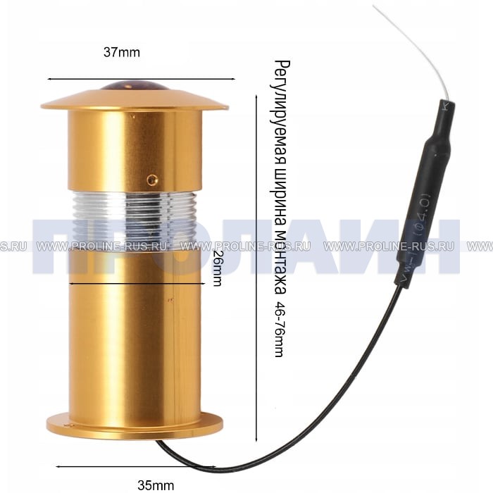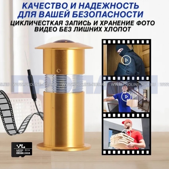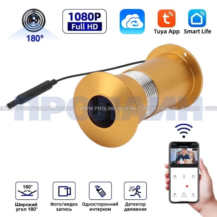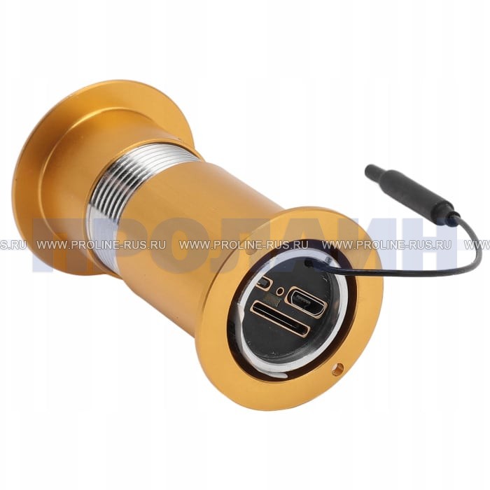 Видеоглазок Proline PR-X04WG золотистого цвета с поддержкой TUYA Wi-Fi представляет собой современное и удобное техническое устройство, которое имеет возможность дистанционного просмотра видео потока с глазка. Вы будете получать уведомления на свой смартфон при обнаружении активности рядом с дверью, а также иметь возможность общения с посетителем у двери, находясь при этом в любой точке планеты, где есть интернет или GSM-сети. Также вы можете удалённо делать фото и непрерывно записывать видео на карту памяти устройства. При настройке звонка есть выбор среди множества мелодий. Используя меню, можно настроить тему на рабочем столе, часы и календарь. Видеоглазки ничем не отличаются от обычных не только визуально, но и своими размерами. Таким образом вы сможете смонтировать их на посадочное место обычных дверных глазков без каких-либо конструктивных изменений. Proline PR-X04WG – это FullHD камера, замаскированная под дверной глазок имеет встроенный датчик движения. Proline PR-X04WG предоставляет возможность просмотра онлайн и записи событий на встроенную карту памяти microSDHC возможно использовать карту емкостью до 128 Гб, происходящих за дверью в ваше отсутствие, а также помогает зафиксировать злоумышленников при попытках проникновения в квартиру. Устройство использует матрицу 1/3” SONY IMX323 2.0 MP CMOS, что обеспечивает запись видео с разрешеним 1920x1080p, позволяя высоко детально зафиксировать происходящее.