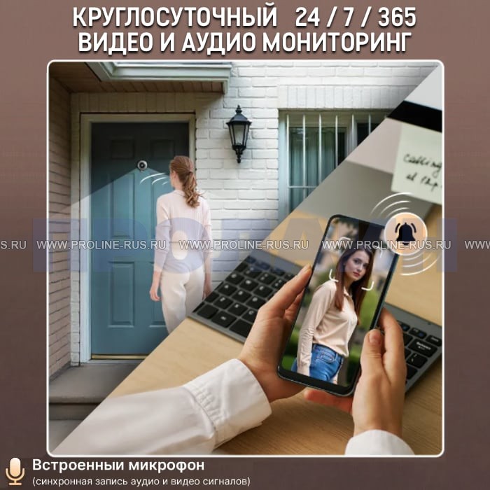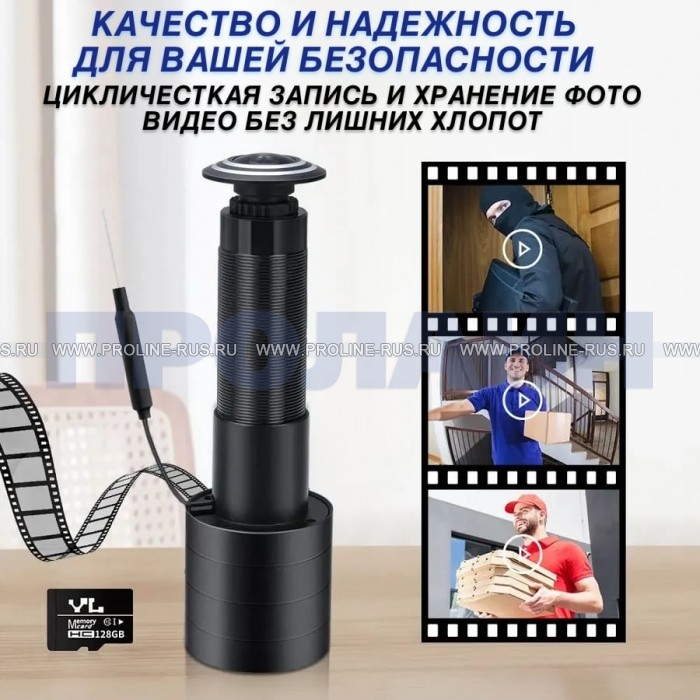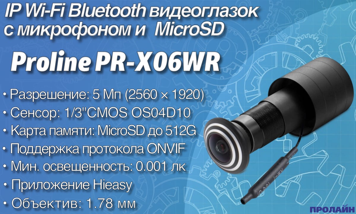 Видеоглазок IP-видеокамера Proline PR-X06WR с поддержкой RJ45, Bluetooth и Wi-Fi представляет собой современное и удобное техническое устройство, которое имеет возможность дистанционного просмотра видео потока с глазка. Вы будете получать уведомления на свой смартфон при обнаружении активности рядом с дверью, а также иметь возможность общения с посетителем у двери, находясь при этом в любой точке планеты, где есть интернет или GSM-сети. Также вы можете удалённо делать фото и непрерывно записывать видео на карту памяти устройства. При настройке звонка есть выбор среди множества мелодий. Используя меню, можно настроить тему на рабочем столе, часы и календарь. Видеоглазки ничем не отличаются от обычных не только визуально, но и своими размерами. Таким образом вы сможете смонтировать их на посадочное место обычных дверных глазков без каких-либо конструктивных изменений. Proline PR-M06W-P – это камера, замаскированная под дверной глазок имеет встроенный датчик движения. Proline PR-X06WR предоставляет возможность просмотра онлайн и записи событий на встроенную карту памяти microSDHC возможно использовать карту емкостью до 128 Гб, происходящих за дверью в ваше отсутствие, а также помогает зафиксировать злоумышленников при попытках проникновения в квартиру. Устройство использует матрицу 1/3"CMOS OS04D10 5.0 MP, что обеспечивает запись видео с разрешеним 2560 × 1920, позволяя высоко детально зафиксировать происходящее.