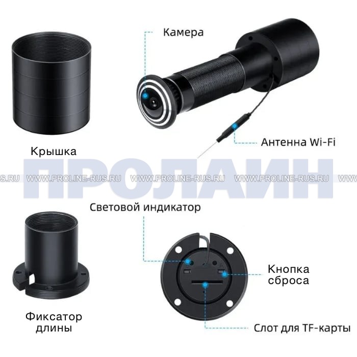 Proline PR-X06WR видеоглазок оснащен цифровым видеомодулем с разрешением 2560 × 1920. Устройство выглядит как обычный глазок и ничем не отличаются не только визуально, но и своими размерами. Благодаря своей цилиндрической форме, видеоглазок легко устанавливается в стандартные деревянные и металлические двери любого типа с диаметром врезного отверстия 23 миллиметра и толщиной от 40 до 85 миллиметров. Крепление в двери видеоглазка осуществляется с помощью спецгайки, накручиваемой на цилиндрический корпус видеоглазка, имеющего резьбу на своей поверхности. Таким образом вы сможете смонтировать их на посадочное место дверных глазков без каких-либо конструктивных изменений. Камера предназначена для функционирования в помещении при комнатной температуре. Питается от источника постоянного тока 12 В или по POE. Благодаря простоте в монтаже и неприхотливости в эксплуатации устройство не требует дополнительных технических знаний и может быть установлено самостоятельно. Специальная линза на объективе предоставляет возможность использовать технологию «Рыбий глаз», что обеспечивает максимальный угол обзора. Это важно для наблюдения за происходящим перед дверью, так как отсутствуют мёртвые зоны, что увеличивает безопасность и контроль за ситуацией. На торцевой части камеры, обращённой внутрь помещения, находятся слот для карты памяти, кнопка сброса настроек, разъём питания и микрофон. Наличие микрофона позволяет добавлять звук к записанному видео, что ещё больше увеличивает информативность запечатлённых событий. Для питания WI-FI видеоглазка необходим сетевой источник питания или внешний аккумулятор, что позволяет гибко подойти к вопросам установки устройства. После установки карты памяти и подключения к источнику питания, на корпус накручивается специальная крышка, затрудняющая доступ к разъёмам посторонним лицам или детям, что добавляет дополнительный уровень безопасности. Гибкая WI-FI антенна, размещённая внутри двери, настраивается для обеспечения максимального радиуса действия передатчика. Важно отметить, что камера работает только на частоте 2,4 ГГц и не поддерживает сеть 5 ГГц, поэтому перед покупкой рекомендуется уточнить информацию о частоте вашего роутера, чтобы гарантировать совместимость устройства.