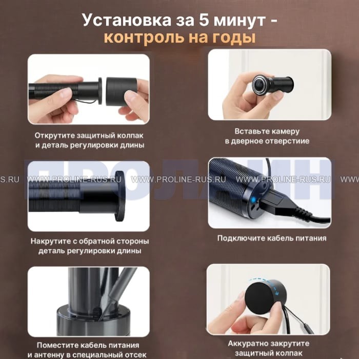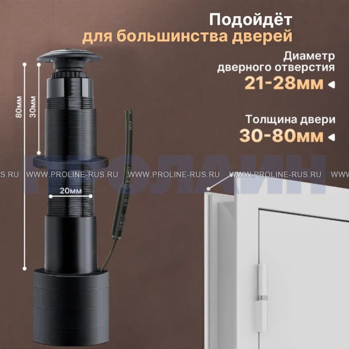 Proline PR-X06WR-P видеоглазок оснащен цифровым видеомодулем с разрешением 2560 × 1920. Устройство выглядит как обычный глазок и ничем не отличаются не только визуально, но и своими размерами. Благодаря своей цилиндрической форме, видеоглазок легко устанавливается в стандартные деревянные и металлические двери любого типа с диаметром врезного отверстия 23 миллиметра и толщиной от 40 до 85 миллиметров. Крепление в двери видеоглазка осуществляется с помощью спецгайки, накручиваемой на цилиндрический корпус видеоглазка, имеющего резьбу на своей поверхности. Таким образом вы сможете смонтировать их на посадочное место дверных глазков без каких-либо конструктивных изменений. Камера предназначена для функционирования в помещении при комнатной температуре. Питается от источника постоянного тока 12 В или по POE. Благодаря простоте в монтаже и неприхотливости в эксплуатации устройство не требует дополнительных технических знаний и может быть установлено самостоятельно. Специальная линза на объективе предоставляет возможность использовать технологию «Рыбий глаз», что обеспечивает максимальный угол обзора. Это важно для наблюдения за происходящим перед дверью, так как отсутствуют мёртвые зоны, что увеличивает безопасность и контроль за ситуацией. На торцевой части камеры, обращённой внутрь помещения, находятся слот для карты памяти, кнопка сброса настроек, разъём питания и микрофон. Наличие микрофона позволяет добавлять звук к записанному видео, что ещё больше увеличивает информативность запечатлённых событий. Для питания WI-FI видеоглазка необходим сетевой источник питания или внешний аккумулятор, что позволяет гибко подойти к вопросам установки устройства. После установки карты памяти и подключения к источнику питания, на корпус накручивается специальная крышка, затрудняющая доступ к разъёмам посторонним лицам или детям, что добавляет дополнительный уровень безопасности. Гибкая WI-FI антенна, размещённая внутри двери, настраивается для обеспечения максимального радиуса действия передатчика. Важно отметить, что камера работает только на частоте 2,4 ГГц и не поддерживает сеть 5 ГГц, поэтому перед покупкой рекомендуется уточнить информацию о частоте вашего роутера, чтобы гарантировать совместимость устройства.