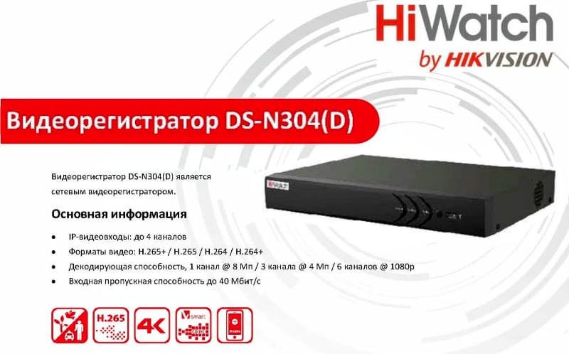 4-канальный видеорегистратор HiWatch DS-N304(D) способен записывать и передавать картинку в качестве 4K (3840 × 2160) и делать снимки в разрешении до 8 МП. Регистратор работает с современными кодеками для наилучшего сжатия видео H.265/H.265+, а также стандартами H.264/H.264+ и MPEG4. Благодаря удобному PoE интерфейсу HiWatch DS-N304(D) может обрабатывать информацию и одновременно питать до 4 устройств в пределах 300 метров от него.
